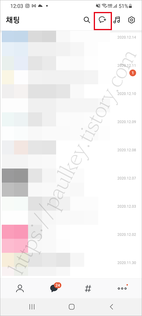 채팅목록화면에서 상단에 보면 채팅추가 아이콘이 보입니다. 채팅추가 아이콘이 뭔지 잘모르겠다면 위 이미지를 보면 상단 우측에 빨간색으로 박스를 해 두었습니다. 채팅추가(새로운 채팅) 아이콘을 쉽게 찾을 수 있을거예요.