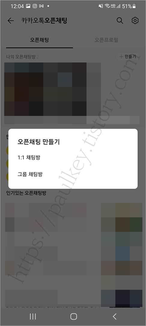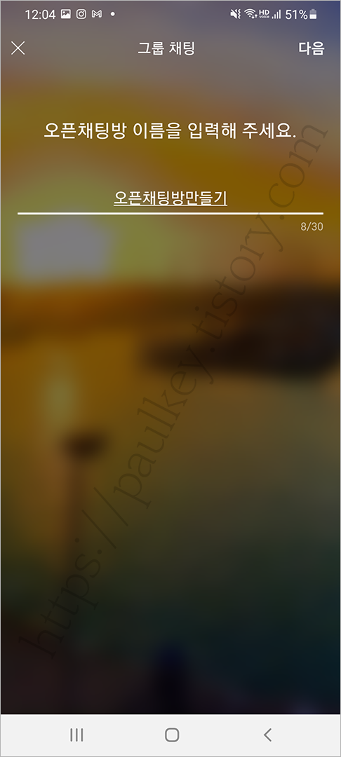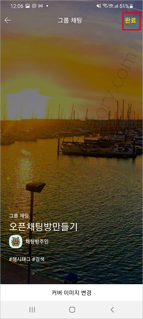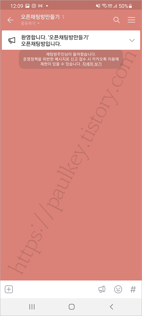 이제 오픈채팅방이 만들어 졌습니다. 커버 이미지도 변경이 가능하니 채팅방 분위기에 맞는 배경을 설정해주면 대화 상대를 모으는데 더 도움이 될 것이라 생각합니다.