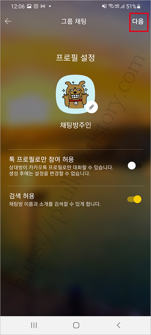 다음은 채팅방 주인의 프로필을 설정합니다. 카카오톡 원래 프로필을 사용해도 되고 위와 같이 새롭게 프로필을 만들어도 됩니다. 위와 같이 새롭게 만들면 본인 카카오톡 프로필을 대화상대가 전혀 알 수 없습니다. 물론 대화상대도 위와 같이 임의이 프로필로 접속을 합니다.