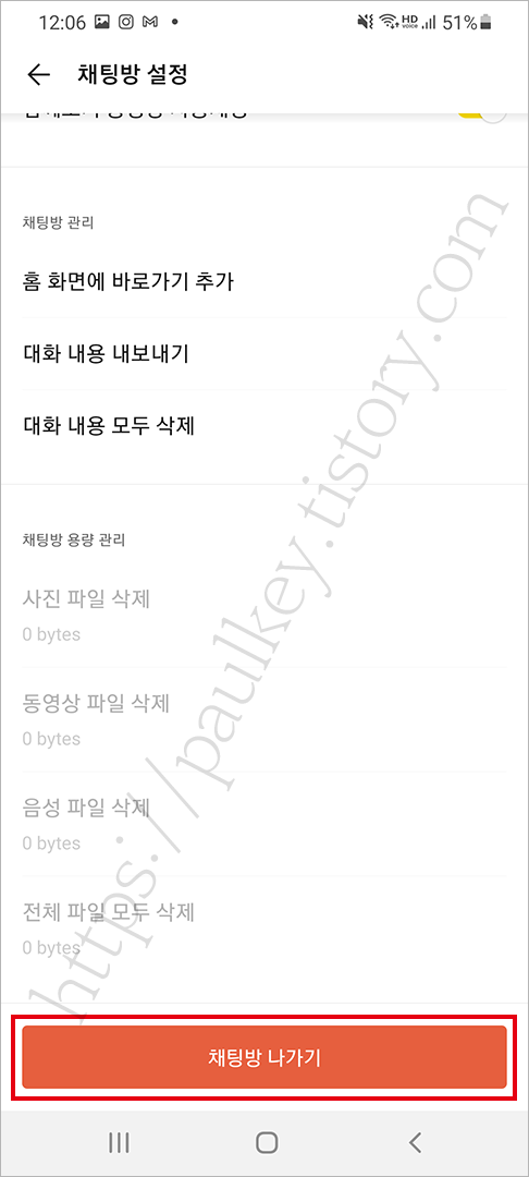 채팅방을 나가는 것도 이곳에서 가능합니다. 채팅방을 삭제를 우너하면 가장 하단에 있는 나가기 버튼을 누르면 채팅방이 나가집니다. 채팅방 나가기를 누르기전 주의 사항은 채팅방의 모든 기록이 삭제됩니다. 또한 기존에 이어가던 대화상대와의 대화도 더이상 할 수 없습니다. 채팅방 나가기전 주의할 점입니다.